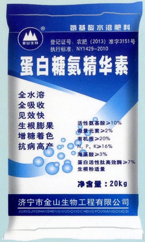 產(chǎn)品特點,本品主要針對經(jīng)濟作物的需肥規(guī)律,采用國內(nèi)先進的科研成果,以18種氨基酸為基礎(chǔ),再配2O%的有機質(zhì),生化黃腐酸,16%的NPK,多種鋅鐵鎂硼鈣中微量元素,及活性肽、蛋白質(zhì)、活性酶、生長素及六類生物菌,科學(xué)復(fù)配而成。配方合理營養(yǎng)全面,速溶。即可補充作物生長所需要的各種營養(yǎng)元素各種活性因子又能促進作物健壯成長,各種微生物的作用又能產(chǎn)生抗生素,生長素使作物抗病性強.生長快,大量有機質(zhì)使作物根系形成良好的微生態(tài)系統(tǒng),改善土壤理化性質(zhì),破除土壤板結(jié)提高土壤的保水、保肥性。增強根的吸收能力提高其他肥料的利用率,提高產(chǎn)量改善品質(zhì),增加效益。